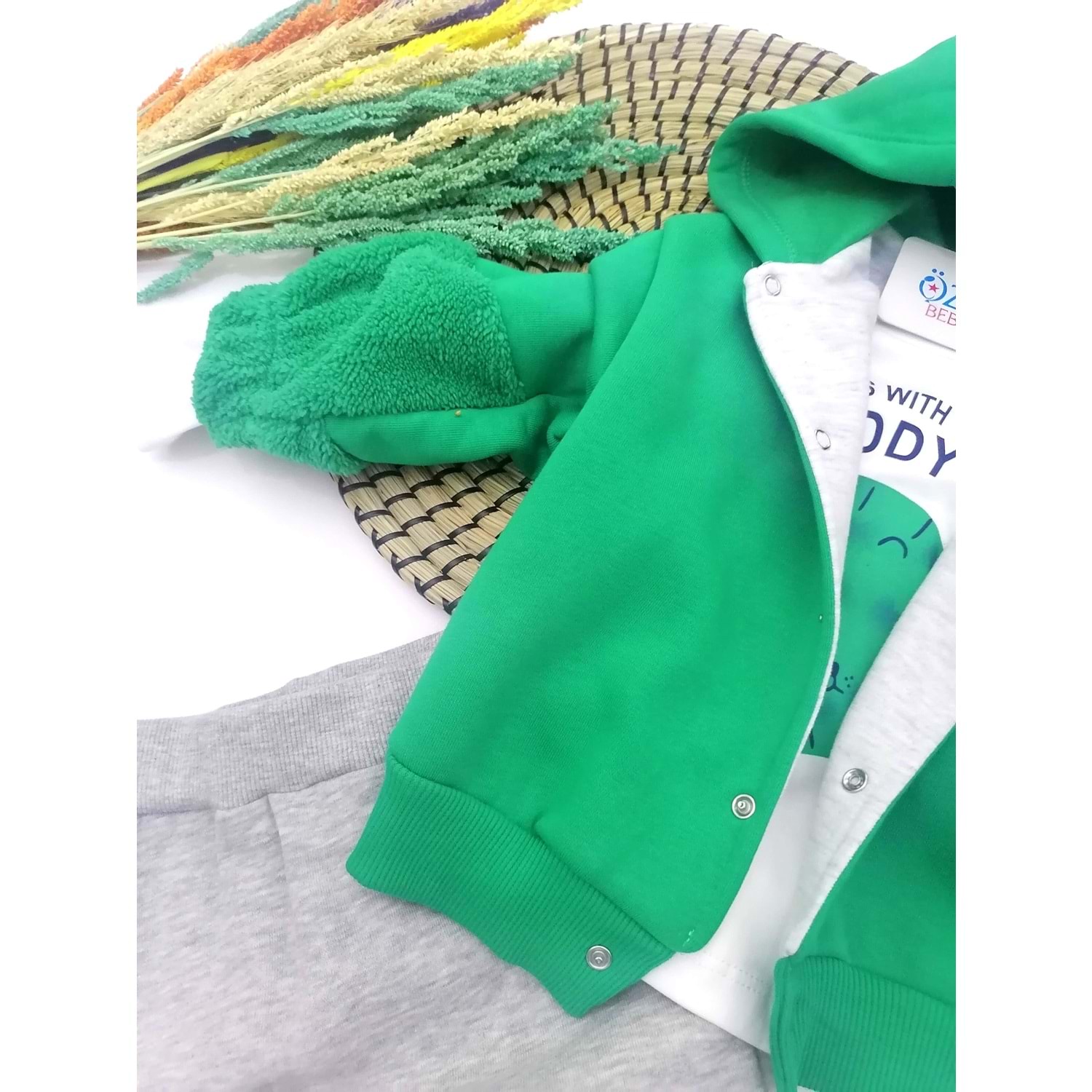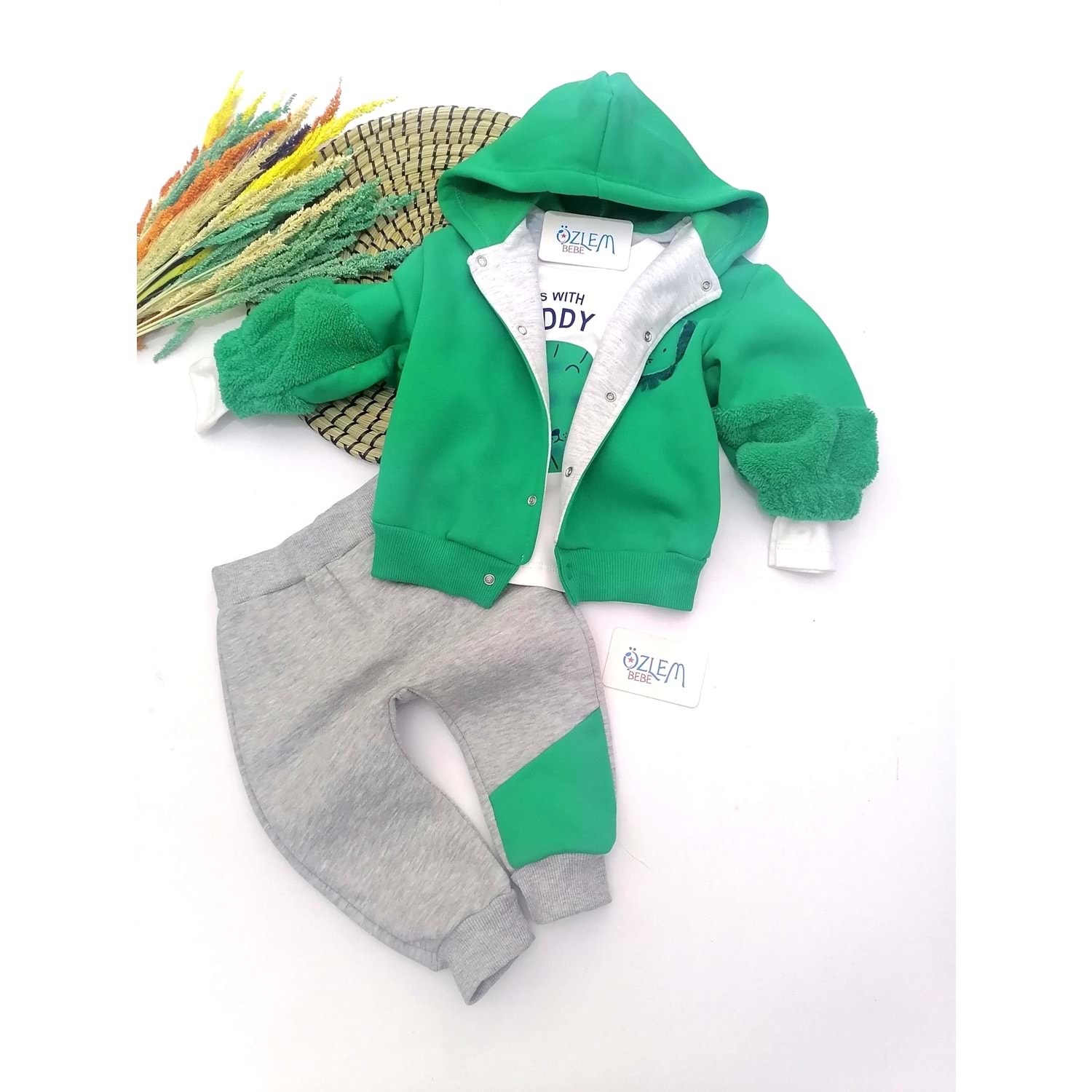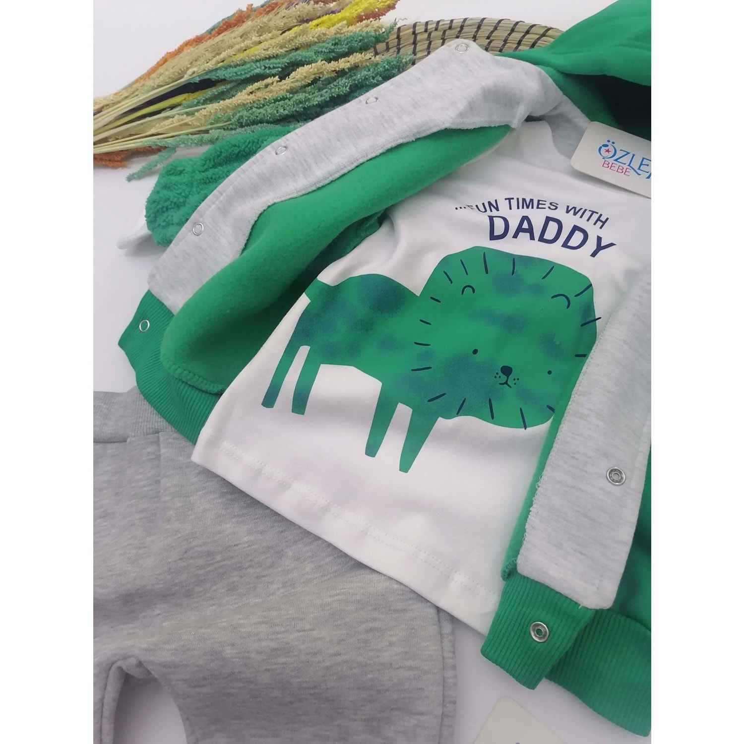 Aslan Figürlü Yeşil Kapüşon Ceketli 3'lü Takım