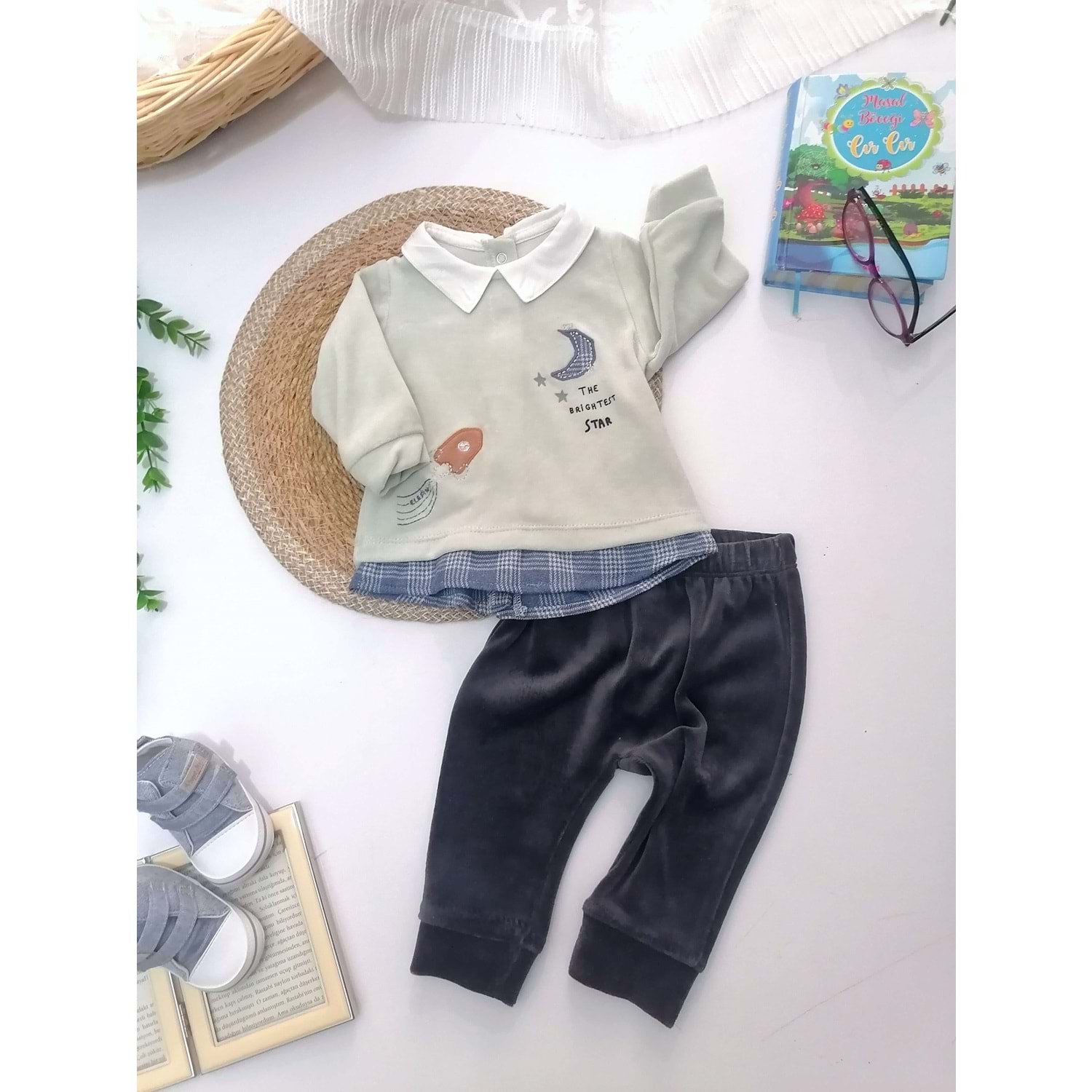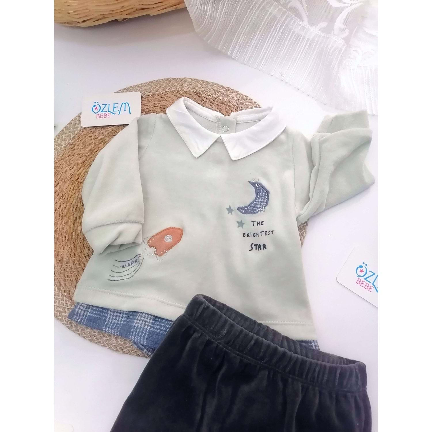Ay ve Roket Desen Kadife 2li Takım
