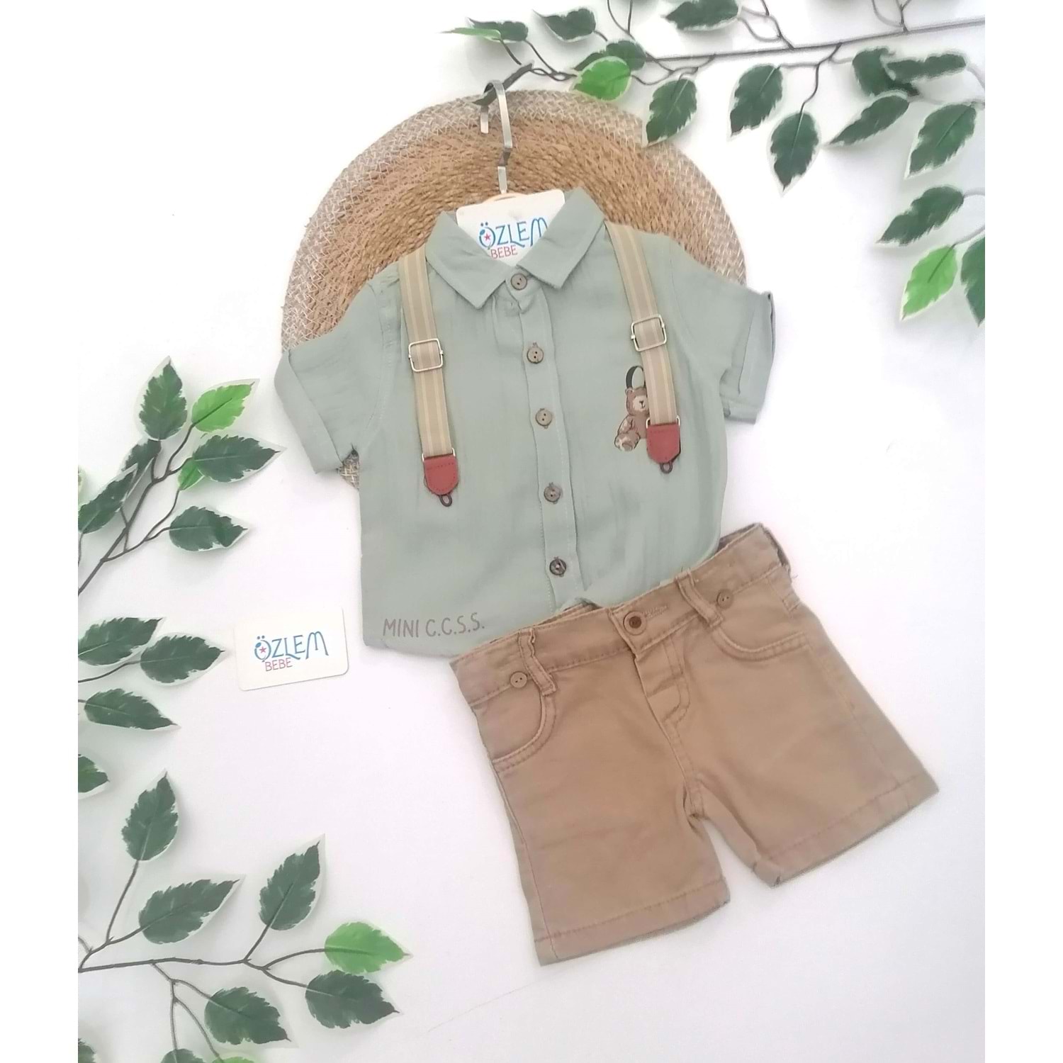 Yeşil Keten Gömlek Pantolon Askılı Şort Takım