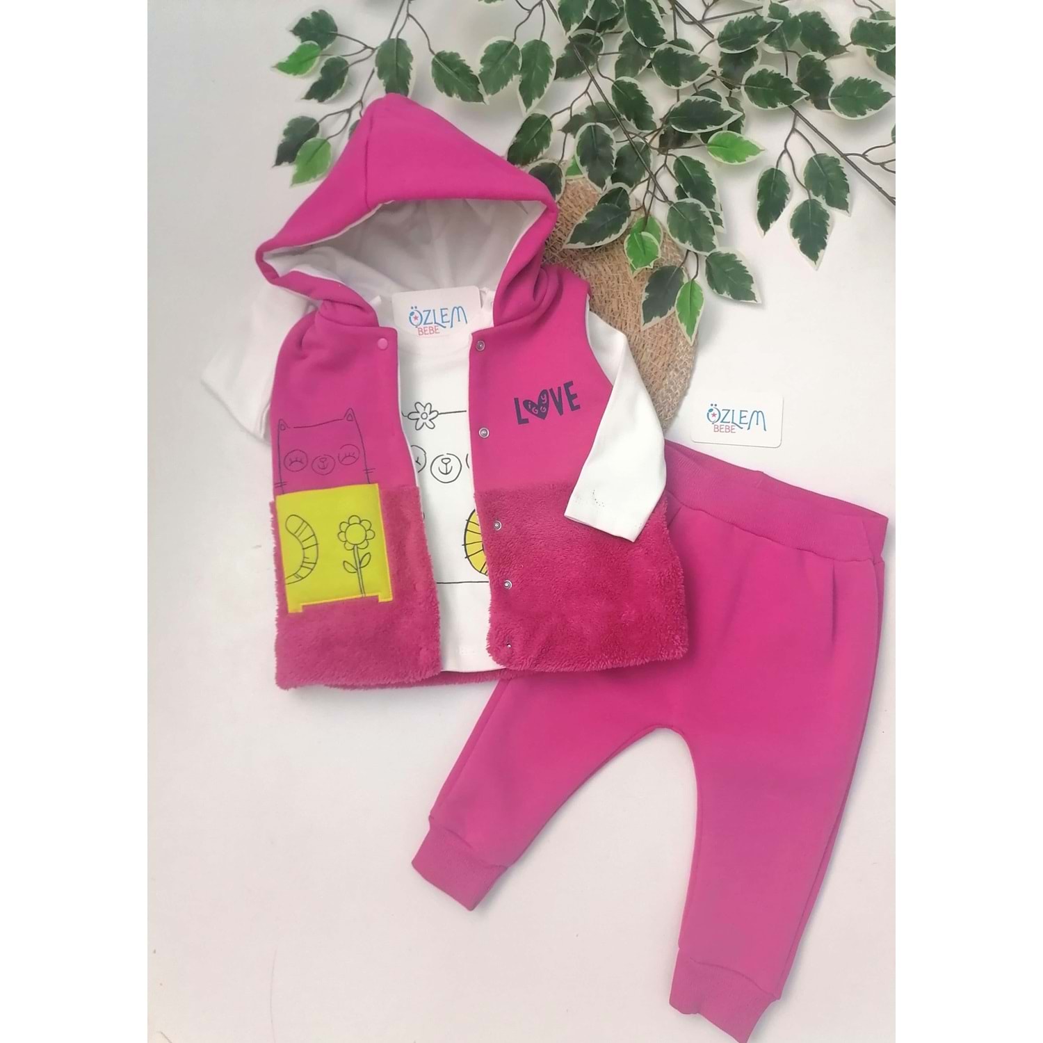 Kedi Figürlü Kapüşon Yelekli Pembe Takım