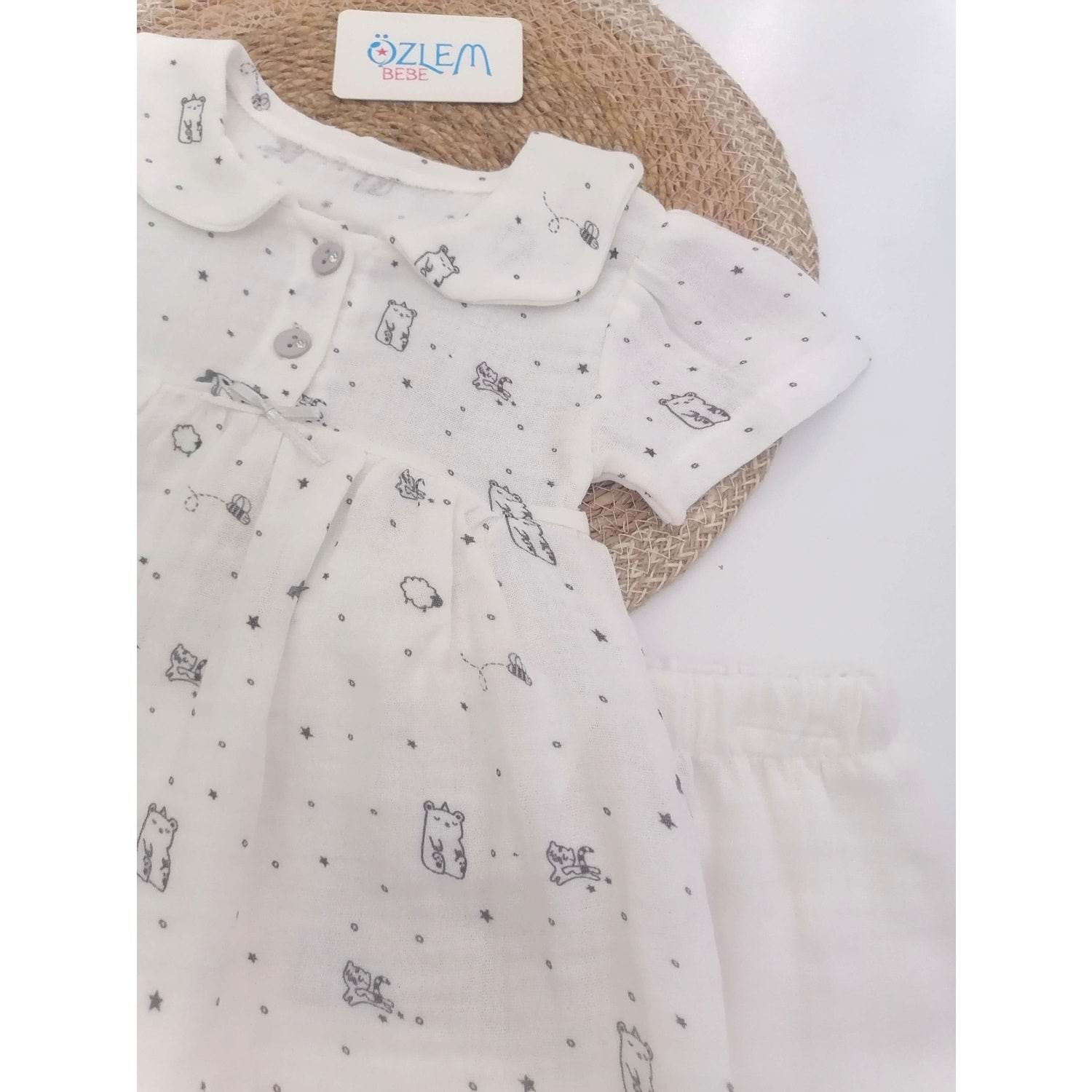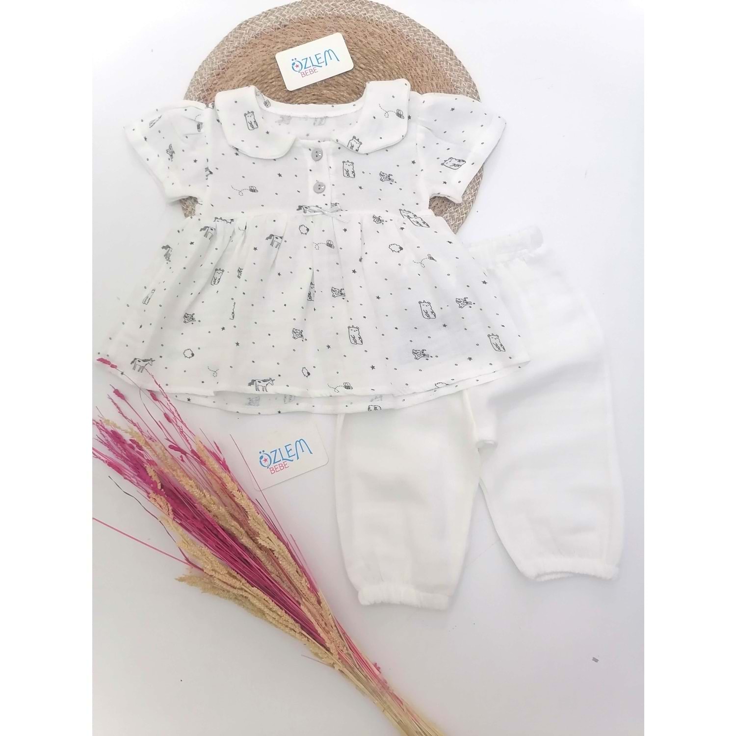 Şirin Kedi Şalvarlı Müslin Beyaz Takım
